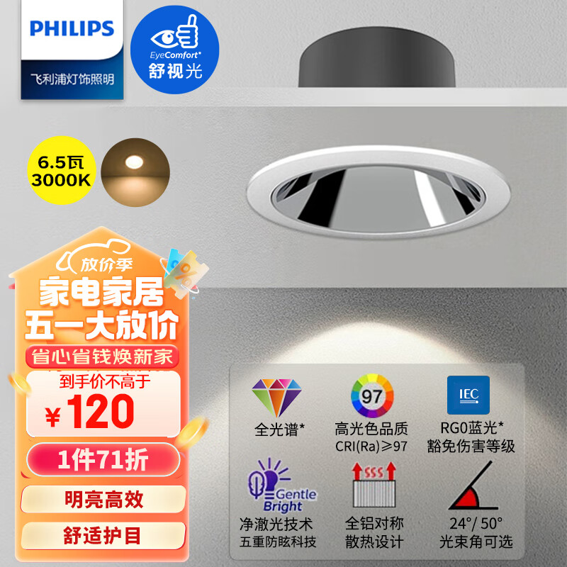 飞利浦全光谱防眩筒灯嵌入式客厅护眼孔灯全铝灯具6.5W3000K孔75-77mm价格:229.00元!