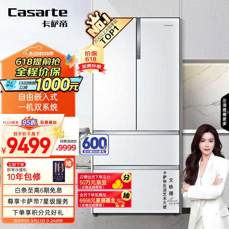 卡萨帝(Casarte)555升纯白系列超薄法式多门四开门超大容量自由嵌入式一级能效家用白色冰箱BCD-555WDGAU1价格:10499.00元!
