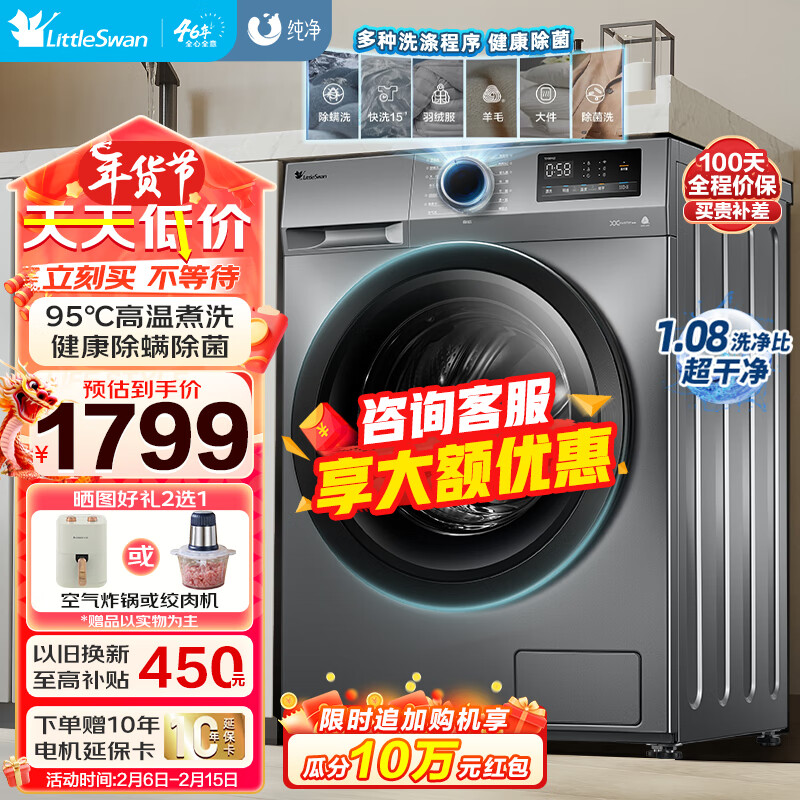 小天鹅(LittleSwan)滚筒洗衣机全自动变频 10公斤大容量 1.08高洗净比除菌净螨 羽绒洗手机操控TG100YQ2【096升级款】价格:1799.00元!