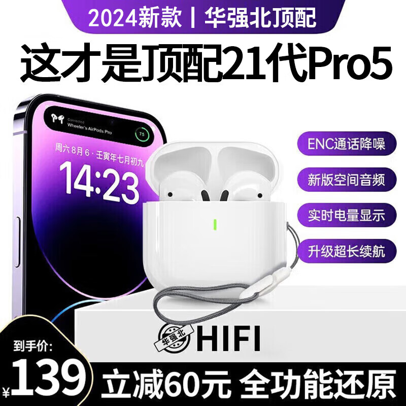 果坊【华强北21代顶配版】适用苹果蓝牙耳机真无线Air降噪iphone15/14/13/12半入耳运动无线充五代 原版Pods顶配【全新升级全功能】 空间音頻+三真电量+通话降噪等价格:199.00元!