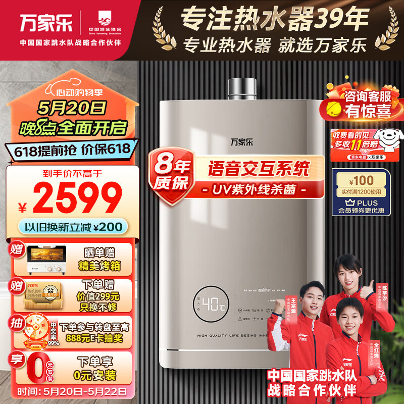万家乐18升 燃气热水器四驱增压零冷水天然气语音无线分控AI智能节能紫外线杀菌阻垢净滤芯JSQ34-18RL11价格:4999.00元!