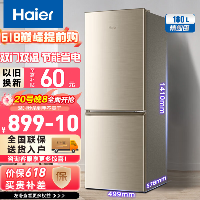 海尔(Haier)冰箱 180升小型家用宿舍租房家电双门小冰箱省电节能直冷迷你两门电冰箱公寓适用价格:899.00元!