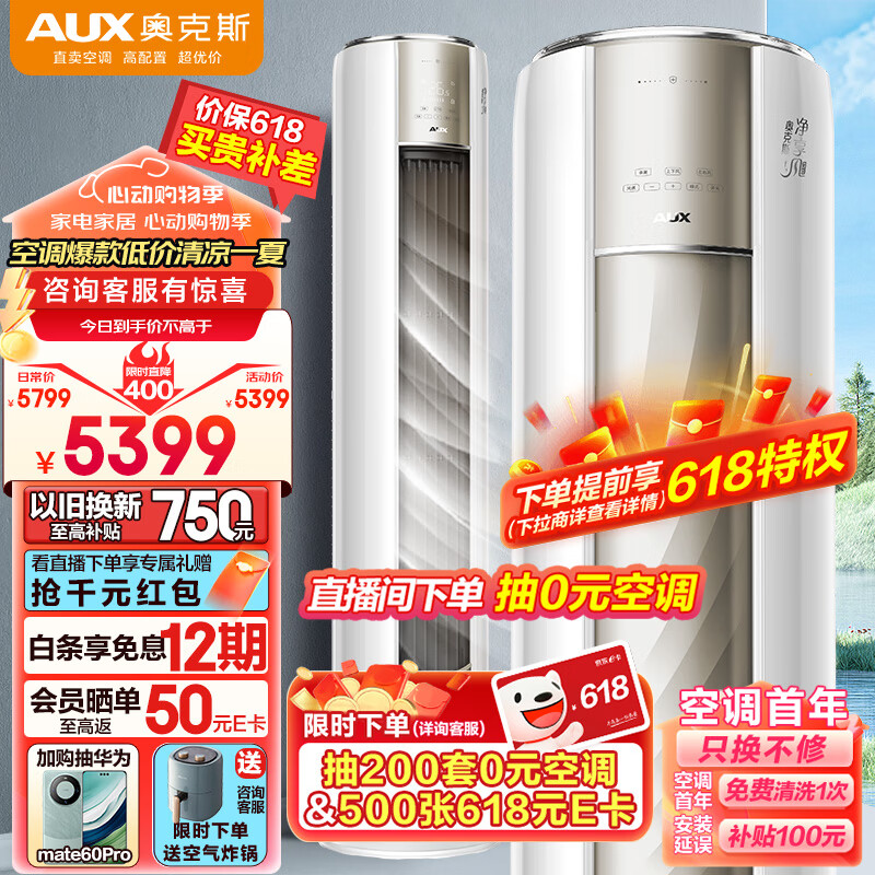 奥克斯(AUX)空调柜机3匹 新一级能效 客厅圆柱立式 冷暖变频节能 WiFi智控KFR-72LW/BpR3AQJ1(B1)价格:5399.00元!