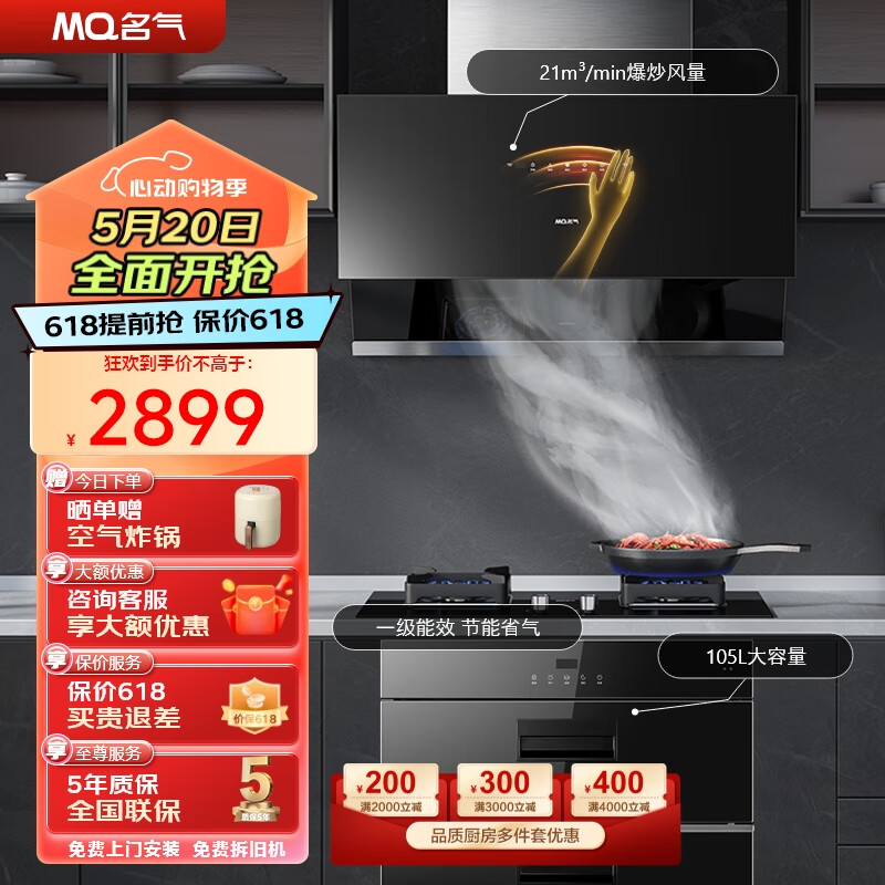 名气(MQ)老板抽油烟机烟灶消三件套装 21m3大吸力挥手智控4.6kW天然气105L大容量消毒柜2535A+B305A+X101价格:2899.00元!