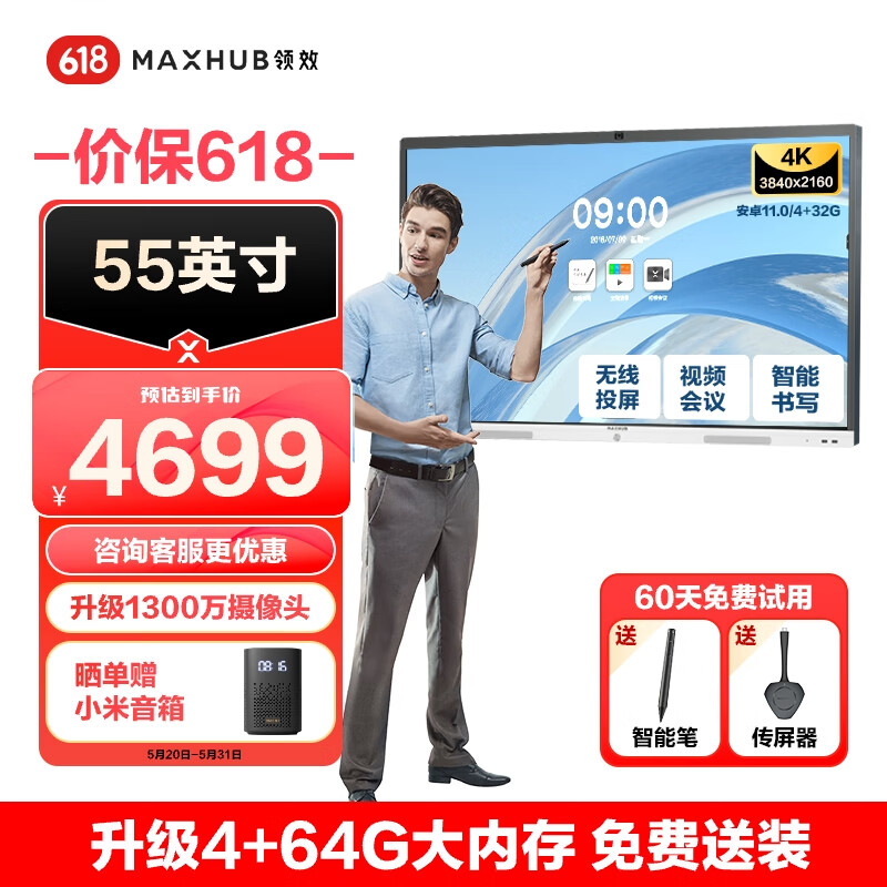 maxhub会议平板V6新锐55英寸触摸视频会议电视一体机 投屏电视智慧屏E55+传屏+笔 企采商用显示价格:5599.00元!
