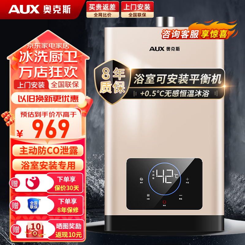奥克斯(AUX)12升燃气热水器家用可装浴室平衡式防CO泄露精控恒温DA53 12升天然气【可安装浴室】价格:969.00元!