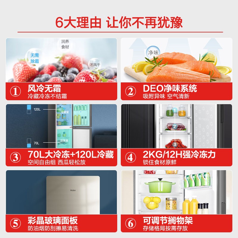 海尔(Haier)190升风冷无霜两门双门小户型迷你家用电冰箱净味彩晶玻璃宿舍租房BCD-190WDCO价格:1899.00元!
