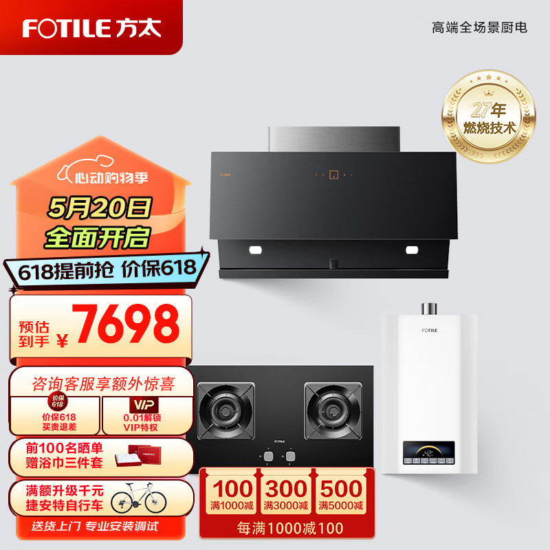 方太(FOTILE)侧吸烟灶热厨房多件套 23风量直流变频烟机5KW猛火灶 16升水伺服燃气热水器JCD11T+02-TH27B+S16D1价格:7698.00元!
