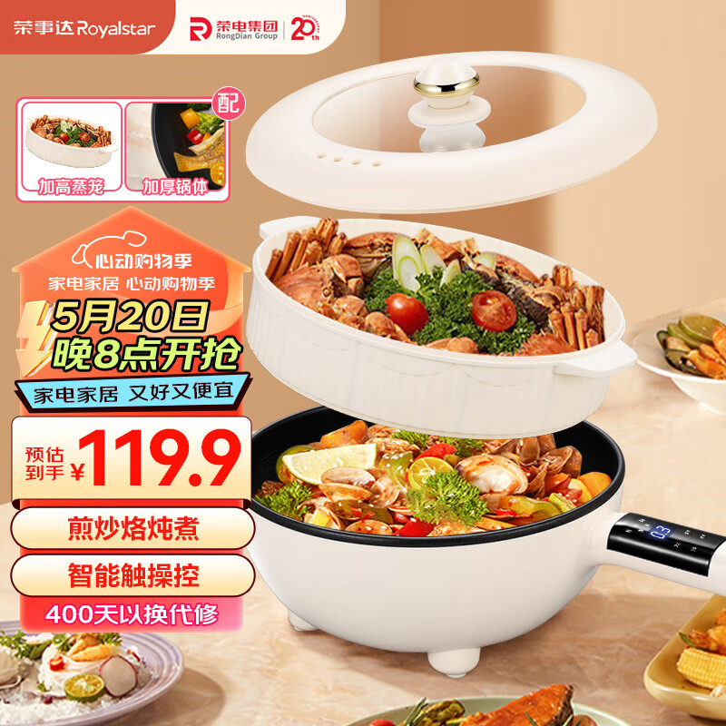 荣事达(Royalstar) 电炒锅 家用电火锅多功能4L容量一体电煮锅煎烤不沾电热锅 DCG04A3价格:119.90元!