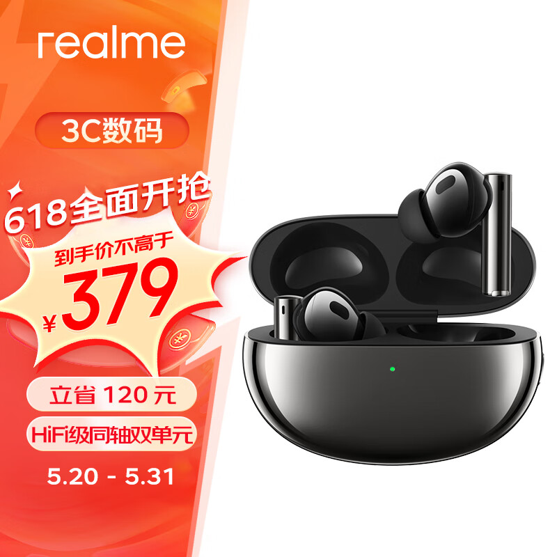 真我(realme)Buds Air5 Pro 真无线蓝牙耳机 50dB主动降噪长续航金标认证 星夜黑 通用苹果安卓小米手机价格:379.00元!
