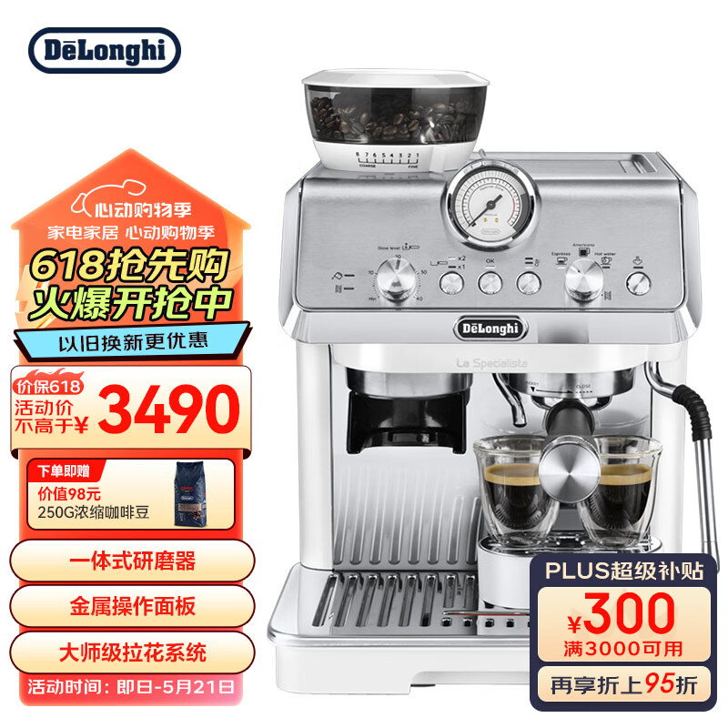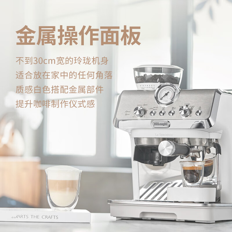 德龙(Delonghi)咖啡机 半自动咖啡机 意式家用 泵压萃取 一体式感应研磨 手动奶泡 小巧机身 EC9155 白色价格:3490.00元!