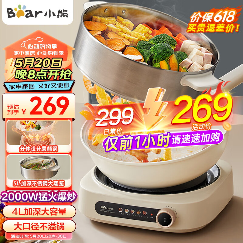 小熊(Bear)电炒锅 家用炒菜专用锅 电煮锅电蒸锅电火锅煎炒蒸煮不沾分体多功能大功率可颠锅爆炒4L DCG-A28L1价格:269.00元!