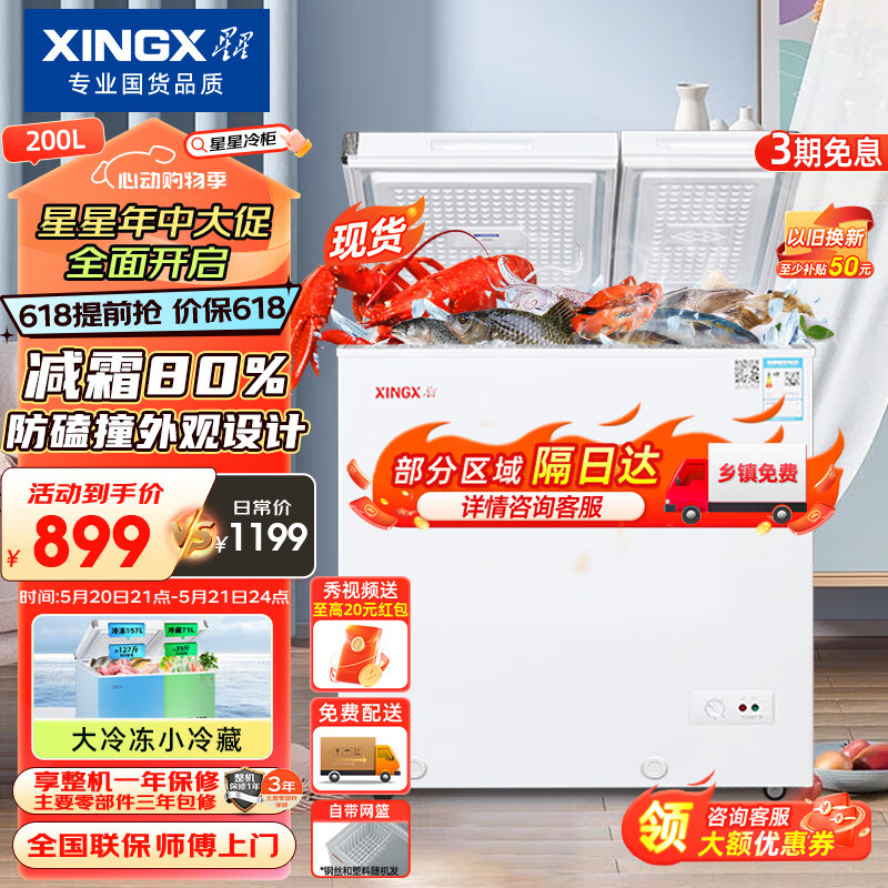星星(XINGX) 200升 微霜商用卧式冰柜 左冷冻右冷藏卧式冰箱 顶开门双温双箱减霜80%冷柜 BCD-200GE价格:899.00元!
