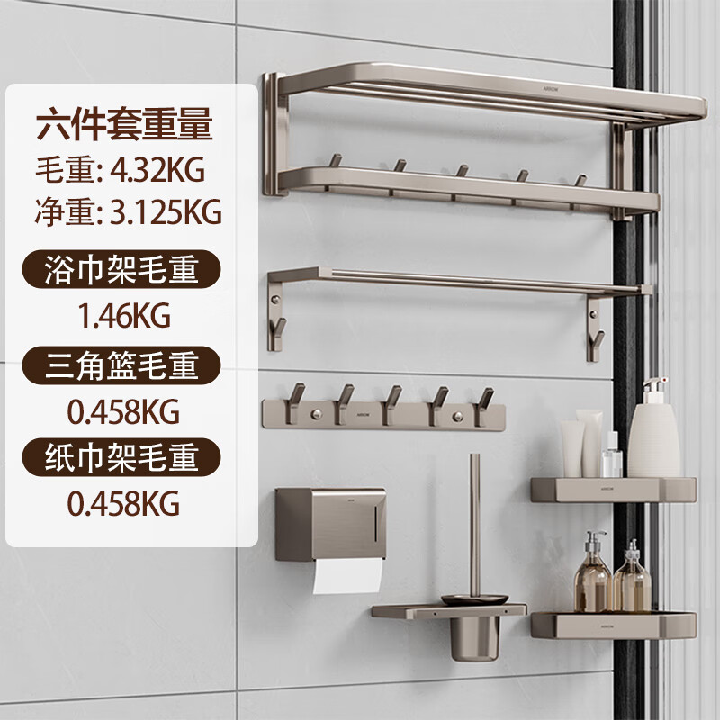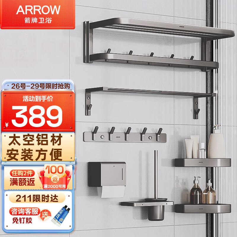 箭牌(ARROW)毛巾架太空铝免打孔卫生间浴室厕所洗手间浴巾架挂件置物架 【枪灰色】加宽扁管太空铝六件套价格:389.00元!