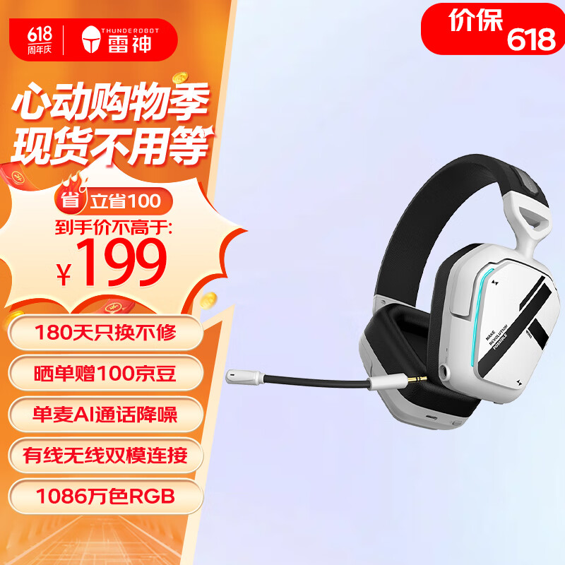 雷神(ThundeRobot)影翼HL504 电竞游戏耳机 头戴式电脑耳机耳麦 蓝牙有线双模降噪 电竞吃鸡耳机耳麦 白色价格:229.00元!