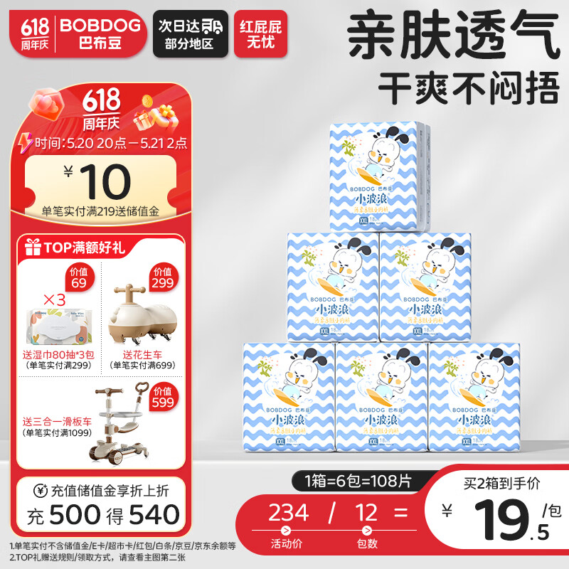 巴布豆(BOBDOG)小波浪薄柔亲肤学步裤XXL108片箱装(15KG以上)加大码婴儿尿不湿价格:117.00元!