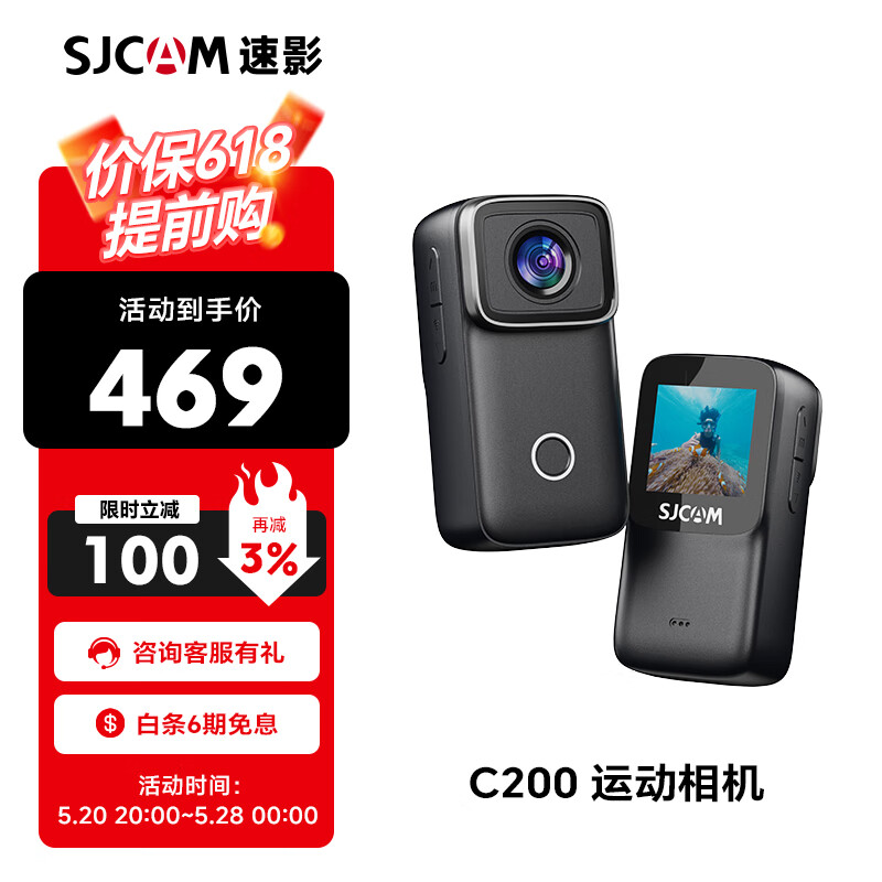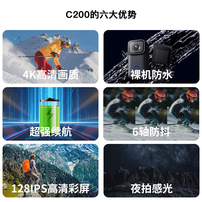 SJCAM 速影C200运动相机360摩托车行车记录仪拇指相机头戴摄像头防抖防水黑色无卡套餐价格:469.00元!