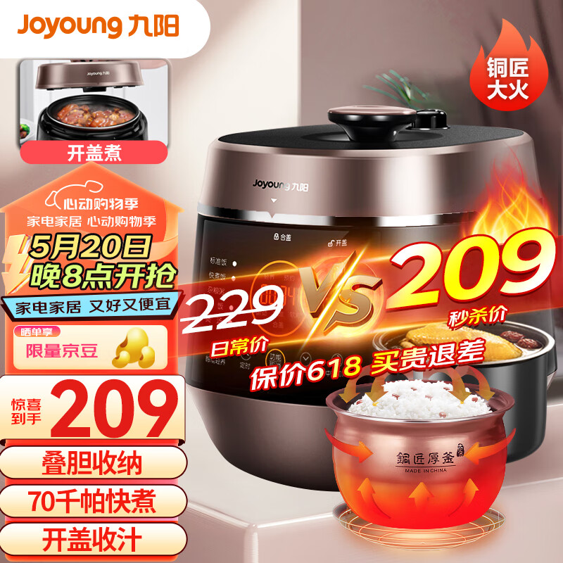 九阳(Joyoung)5升智能家用一锅双胆多功能电锅煲铜匠大火开盖营养煮高压锅预约定时电高压锅Y-50C82价格:209.00元!