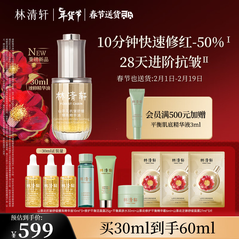 林清轩速修精华油30ml 山茶花抗皱舒缓爆珠油 妆前精华 新年礼物送女友价格:699.00元!