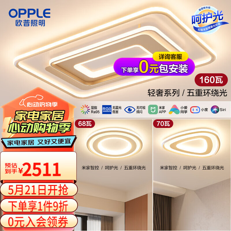 欧普照明(OPPLE) 吸顶灯客厅大灯米家智控LED照明灯具套餐1呵护光价格:2790.00元!