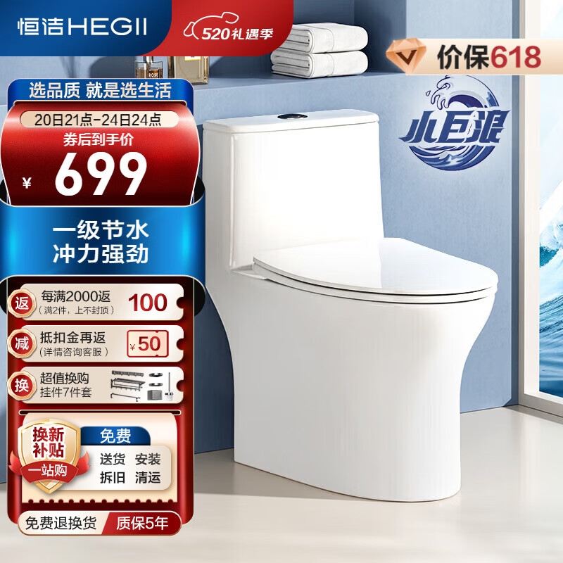 恒洁(HEGII)马桶513 家用虹吸小巨浪马桶节水小户型卫生间坐便器HC0513PT-305价格:1059.00元!