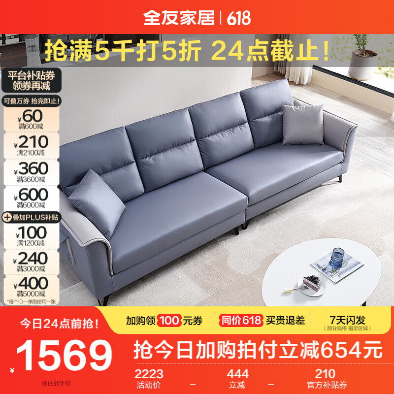 全友家居北欧休闲沙发简约科技布沙发四人位沙发直排客厅小户型102567价格:2223.75元!