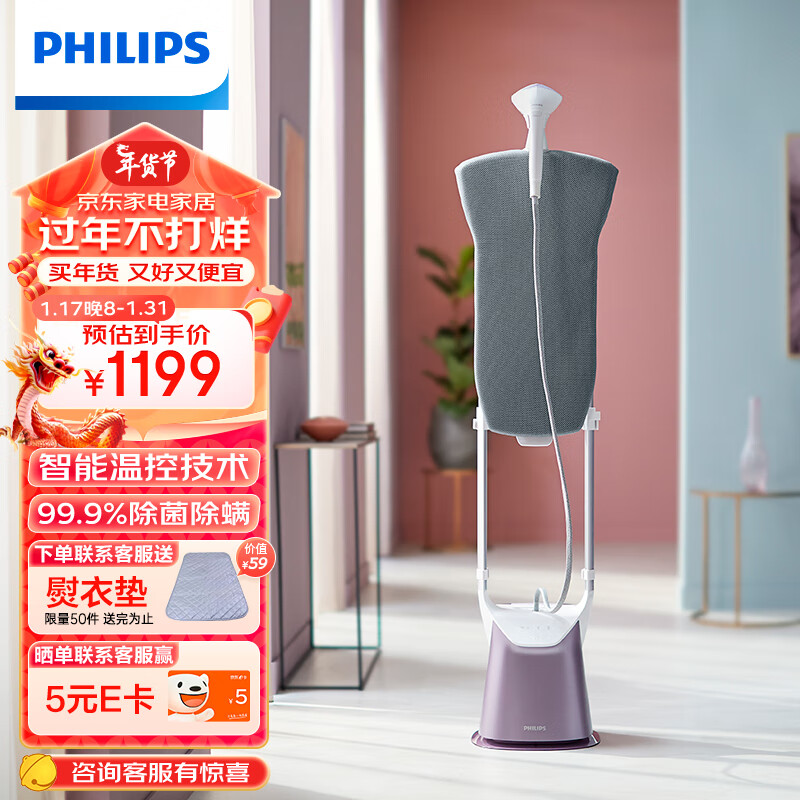 飞利浦 (PHILIPS) 立式增压熨烫机蒸汽挂烫机家用除菌除螨双杆带烫衣板GC626/38价格:1332.00元!