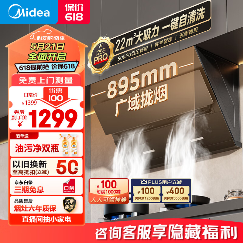 美的(Midea)抽油烟机 家用厨房22风量侧吸式吸烟机 挥手智控 自动清洗 脱排油烟机CXW-280-J25S PRO价格:1399.00元!