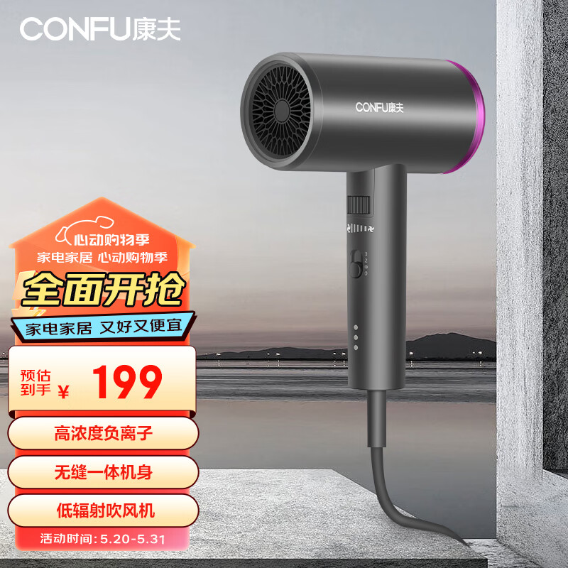 康夫(CONFU)电吹风机家用低辐射1800W大功率负离子恒温护发大风力速干冷热风宿舍吹风筒KF-3149价格:199.00元!