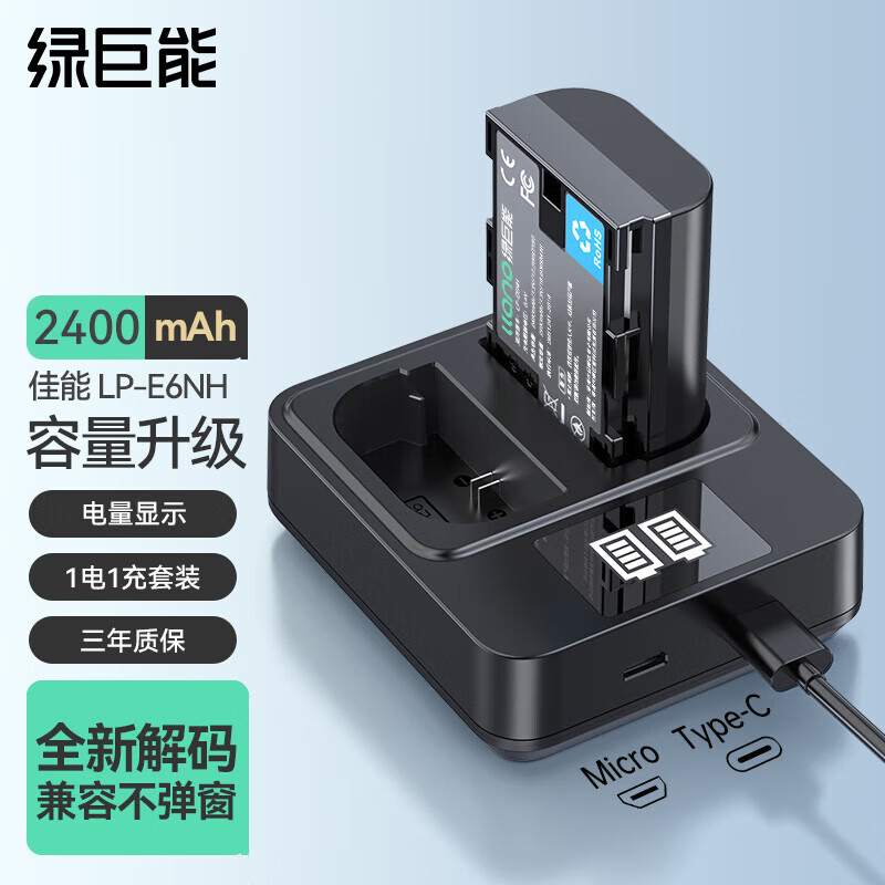 绿巨能(llano)佳能电池LP-E6NH相机电池充电器套装适用60D 5d4 5D3 6D 90D 80D 70D 6D2单反数码相机一电双充价格:219.00元!