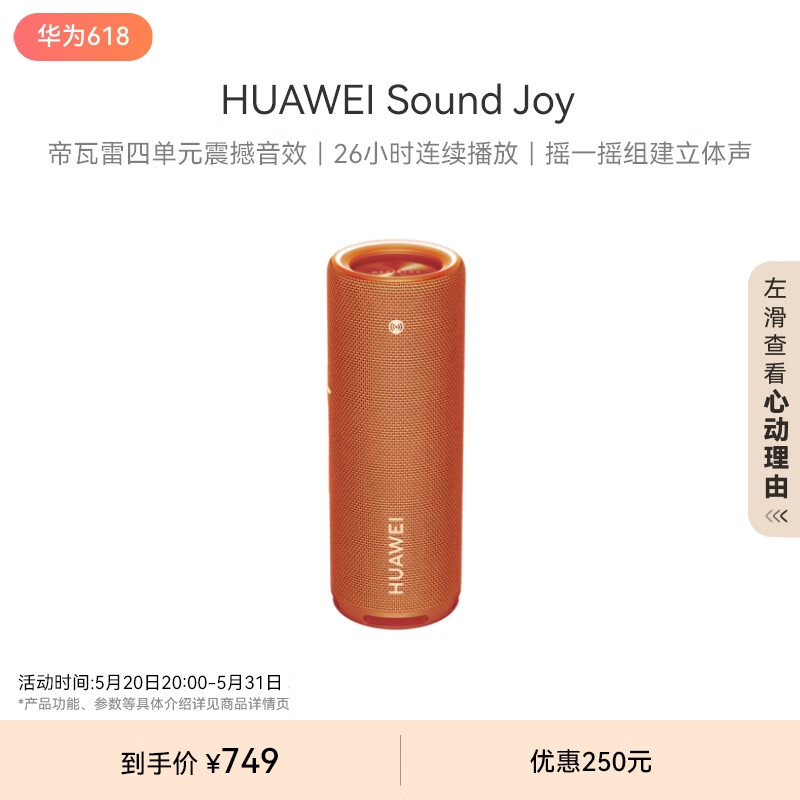 华为Sound Joy 便携式智能蓝牙音箱 电脑音响 两台组建立体声 26小时长续航户外音箱 活力橙价格:749.00元!