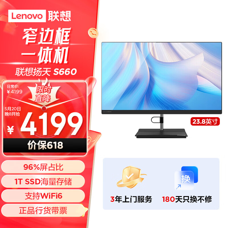联想(Lenovo)扬天S660 23.8英寸家用高清商用办公一体机台式电脑主机(12代酷睿i5-12450H 16G 1TB SSD)价格:4199.00元!