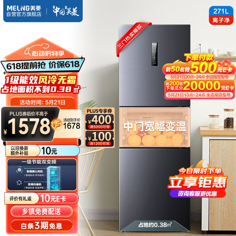 美菱(MeiLing)【离子净】271升三门家用冰箱三开门变频一级风冷无霜低噪租房宿舍小冰箱BCD-271WP3CX以旧换新灰价格:1678.00元!