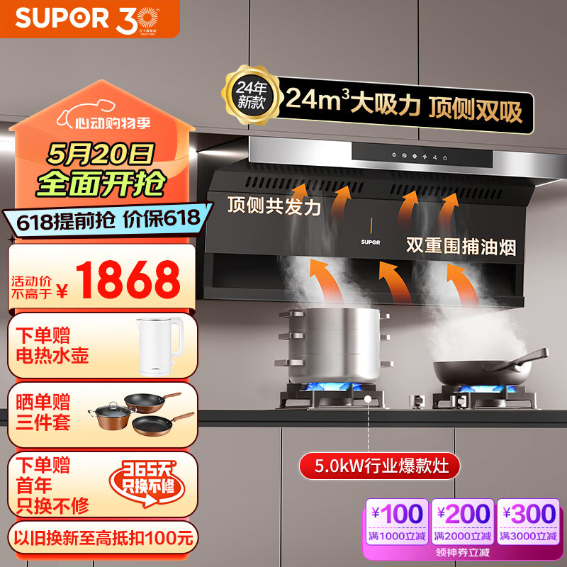 苏泊尔(SUPOR)抽油烟机 顶侧双吸7字型烟灶套装24立方挥手免拆洗家用烟机燃气灶具套装DL11+Q5液价格:1868.00元!