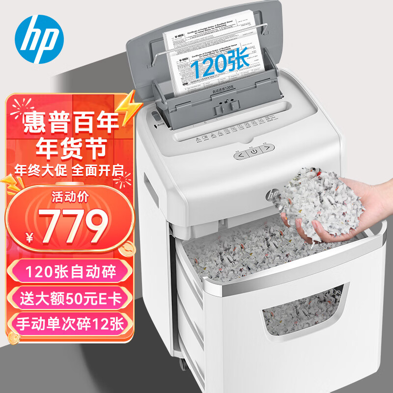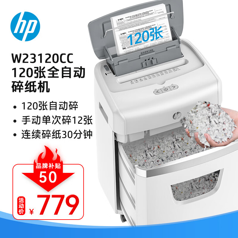 HP惠普(HP)全自动120张碎纸机4级高保密办公大型商用粉碎机(手动12张自动持续碎30分钟)W23120CC价格:899.00元!