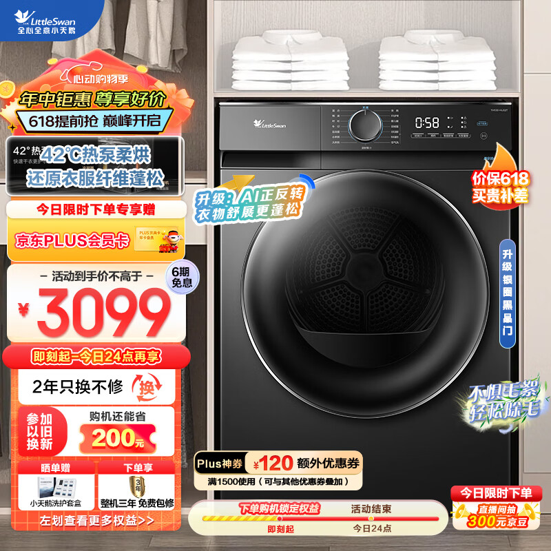 小天鹅(LittleSwan)10KG热泵烘干机 家用干衣机 AI正反转 祛味除螨除潮 回南天烘干机 超薄TH100-HL02T价格:3099.00元!