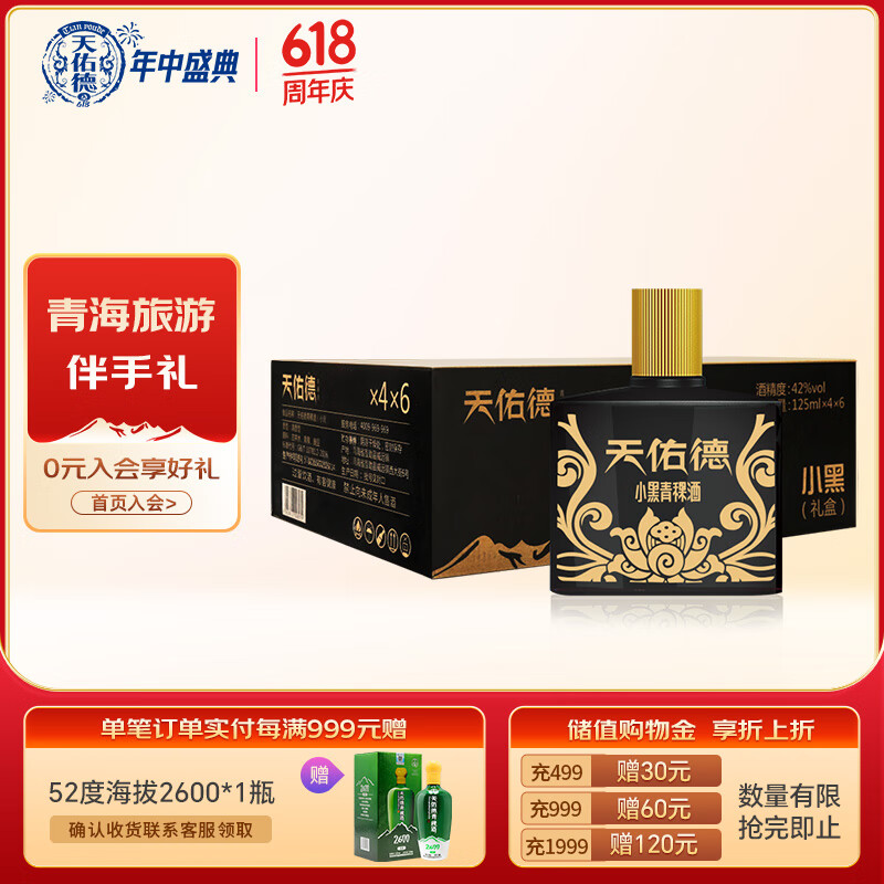 天佑德 小黑 清香型白酒 42度 125ml*4瓶*6盒 整箱装【青海青稞酒】价格:536.00元!