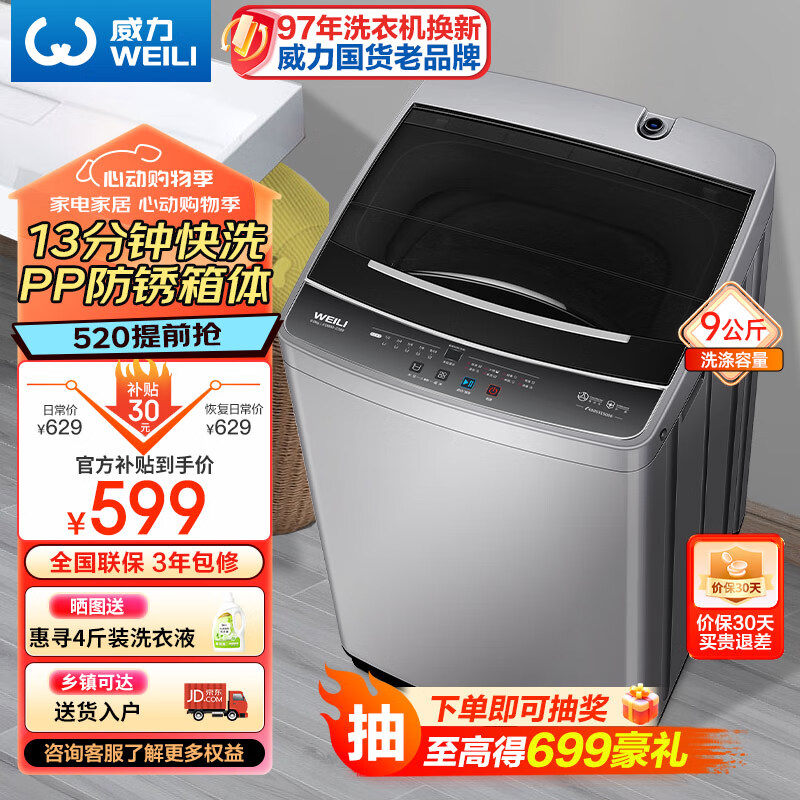 威力(WEILI)9公斤大容量全自动波轮洗衣机 护衣内筒 13分钟快洗 防锈箱体 十档水位 以旧换新 XQB90-2399价格:599.00元!