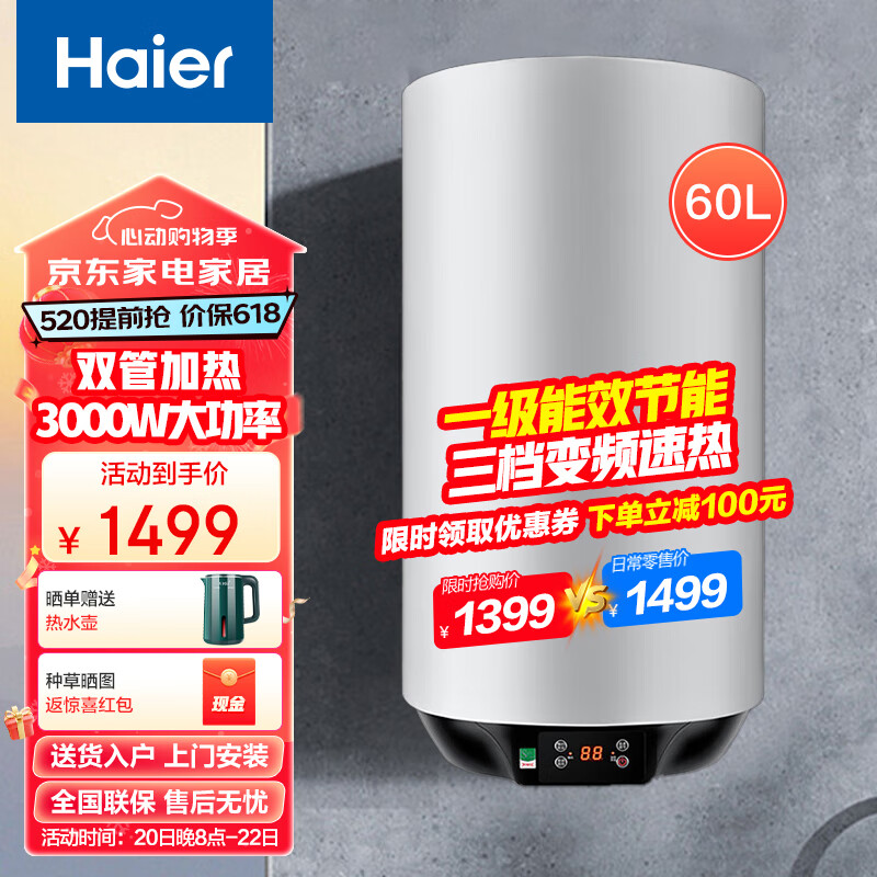 海尔(Haier)立式热水器 60升家用变频3000W速热竖式电热水器 一级能效节能即热储水式预约洗浴增容U1[家电]价格:1499.00元!