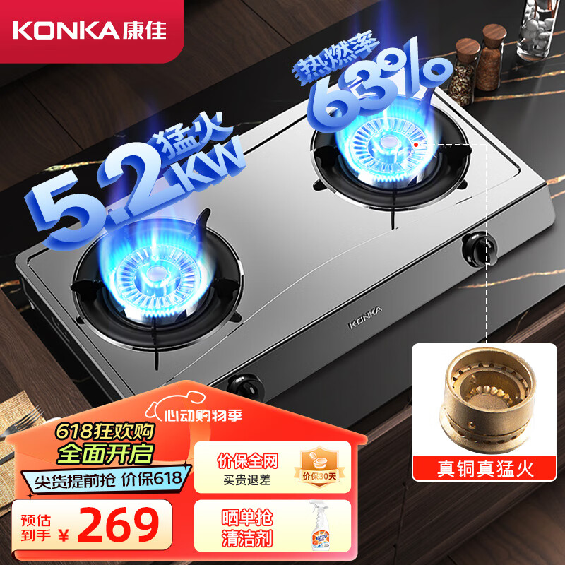 康佳(KONKA)燃气灶双灶具 5.2kW大火力台式灶天然气双灶 家用猛火炉具 不锈钢灶台 JZT-T502Y(天然气)价格:268.40元!