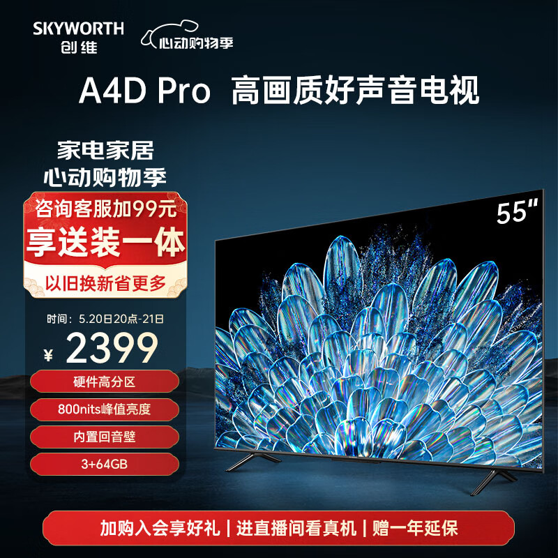 创维电视55A4D Pro 55英寸电视机原彩抗光屏800nit亮度内置回音壁高分区120Hz高刷液晶防蓝光护眼电视价格:2499.00元!