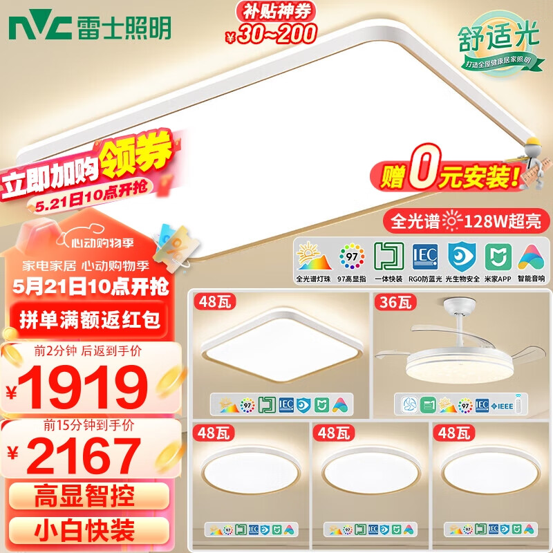 雷士(NVC)吸顶灯客厅灯led卧室风扇灯全屋套餐全光谱护眼小白灯沐光F舒适光价格:3623.00元!
