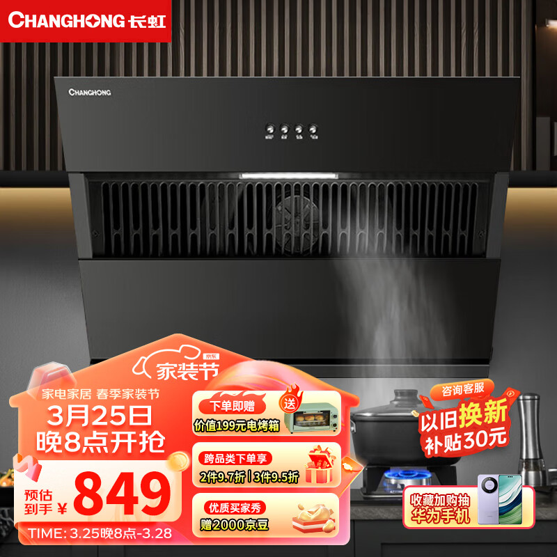 长虹(CHANGHONG)侧吸 油烟机 家用 21m3爆炒大吸力 自动清洗易清洁玻璃 手势控制 900宽域拢烟 一级能效 J311S价格:849.00元!