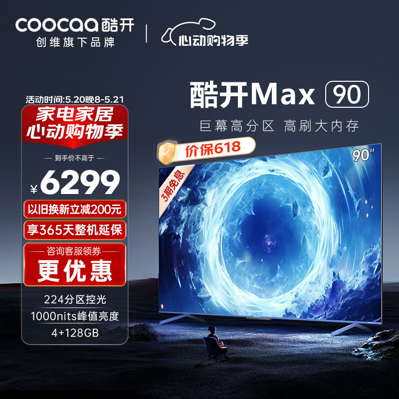 酷开创维Max90 90英寸电视 224分区控光 1000nits峰值亮度4+128G 120Hz高刷护眼声控智能电视机90P60 P价格:6699.00元!