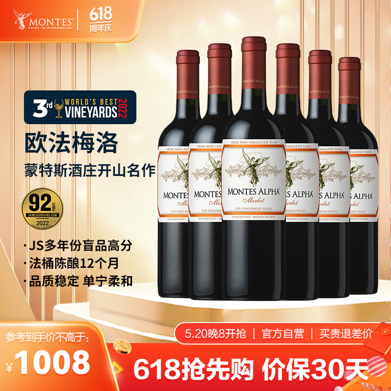 MONTES蒙特斯欧法梅洛红酒葡萄酒750ml*6整箱日常婚礼宴请智利原瓶进口价格:1008.00元!