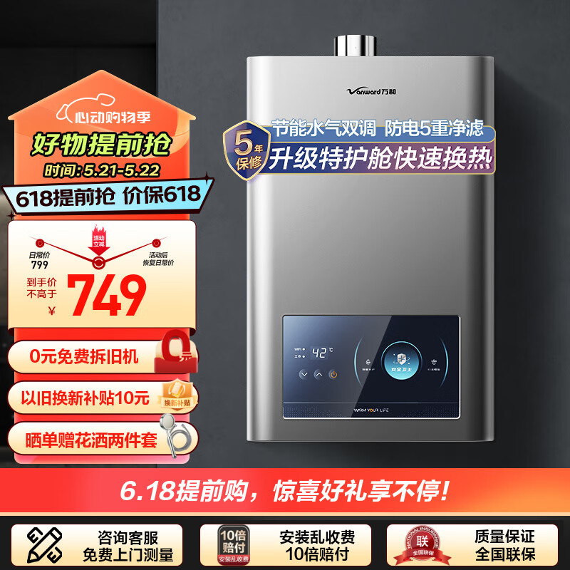 万和(Vanward)12升燃气热水器液化气水气双调恒温ECO节能5重净滤双防电防冻 E2D12-20Y【升级特护舱快速换热】价格:749.00元!