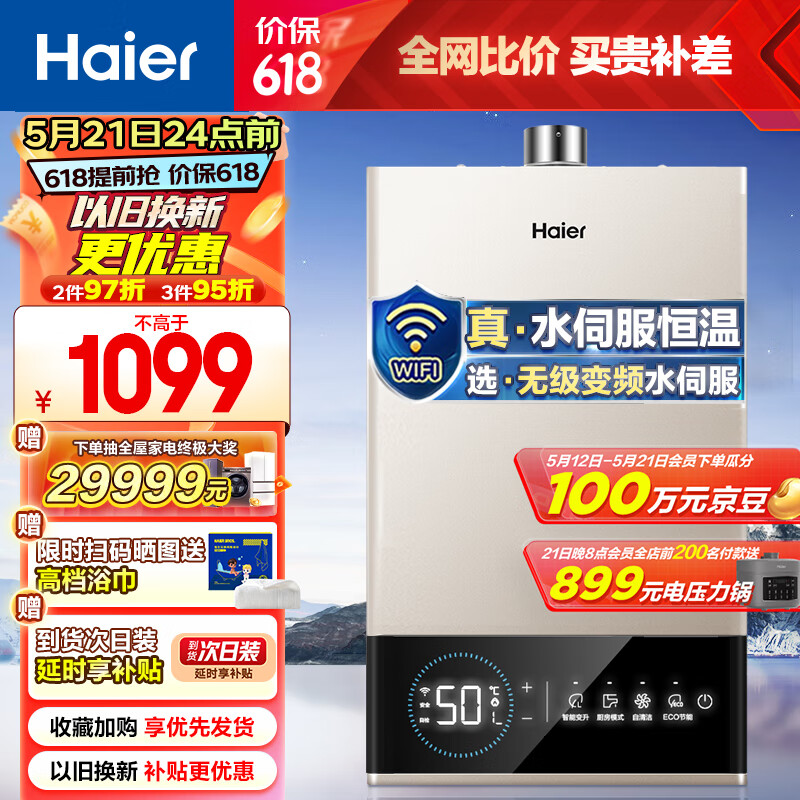 海尔(Haier)13升燃气热水器天然气无级变频水伺服恒温智护自洁家用智慧节能JSQ25-13JM6(12T)U1 京东小家智能价格:1199.00元!