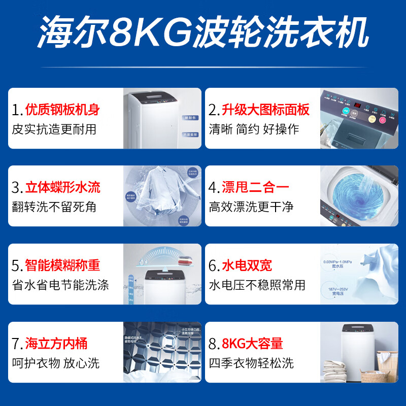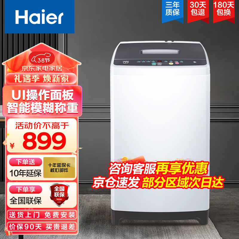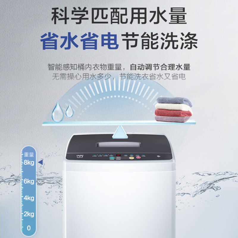 海尔(Haier)洗衣机8公斤全自动波轮小型家用节能省水省电学生宿舍租房漂甩二合一大神童XQB80-M106[家电]价格:899.00元!