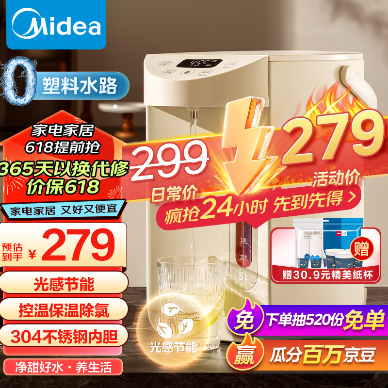 美的(Midea)0塑料水路电水瓶电热水壶304不锈钢5L大容量智能多段温控恒温烧水壶除氯光感节能热水瓶01C价格:279.00元!
