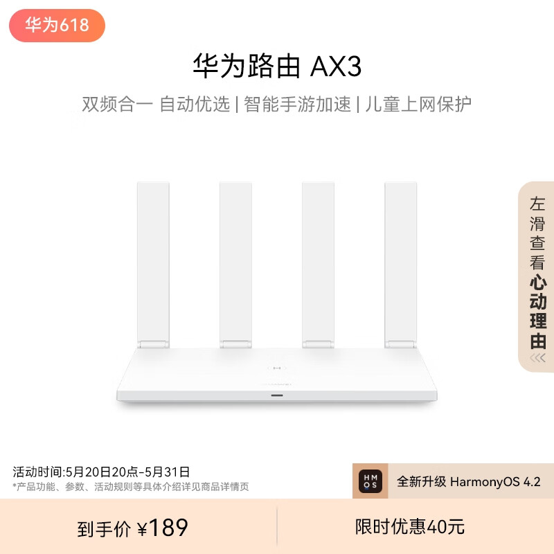 华为路由AX3 双频合一 自动优选 智能手游加速 wifi6/多连不卡无线家用穿墙/AX3000/高速千兆路由器价格:169.00元!